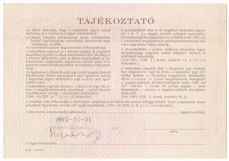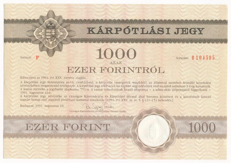 Leírás: Budapest 1991. "Országos Kárrendezési és Kárpótlási Hivatal" kárpótlási jegye 1000Ft-ról, "F" sorozat T:AU