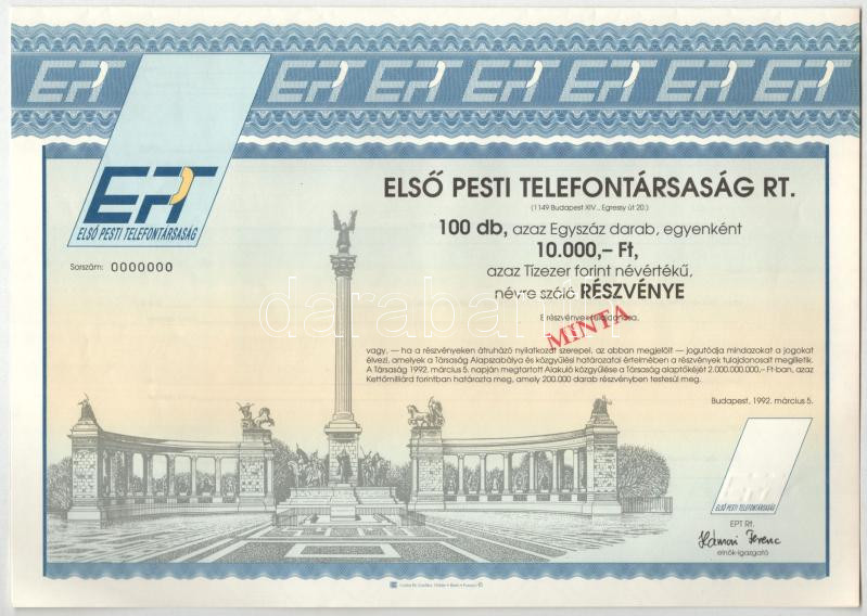 Leírás: Budapest 1992. "Első Pesti Telefontársaság Rt." száz részvénye egyben, összesen 1.000.000Ft értékben, "MINTA" bélyegzéssel, 000-ás sorszámmal T:AU