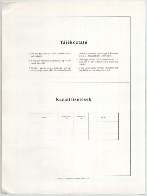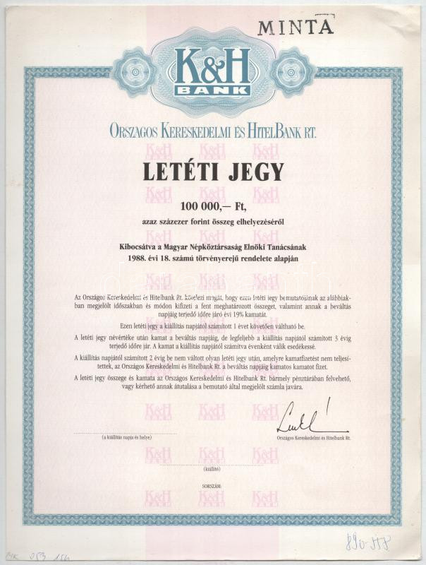 Leírás: Budapest ~1988. "Országos Kereskedelmi és Hitelbank Rt." letéti jegye 100.000Ft-ról "MINTA" felülbélyegzéssel T:AU