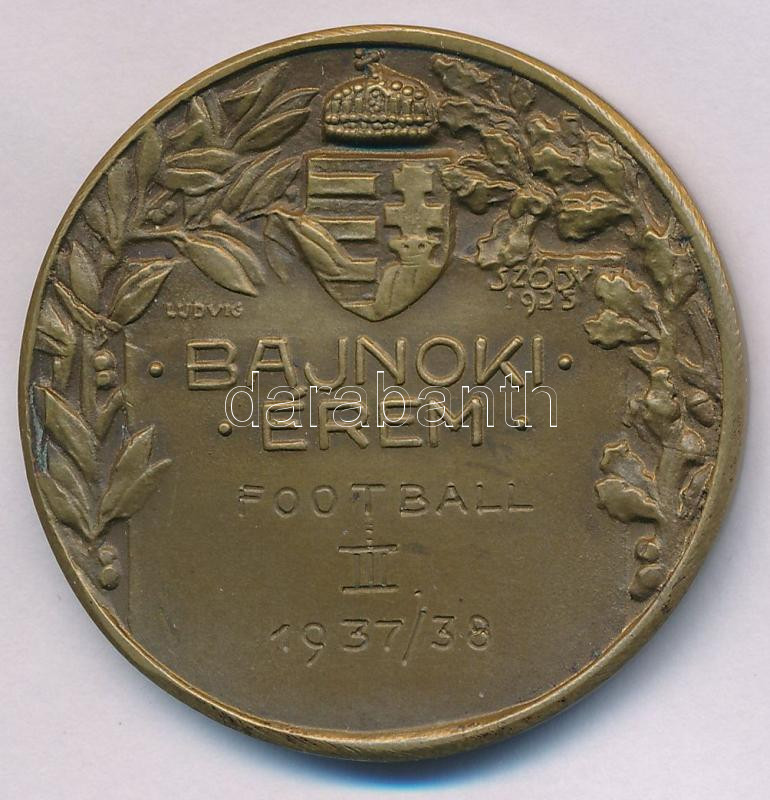Leírás: Sződy Szilárd (1878-1939) 1938. "Magyar Főiskolai Sportegyletek Egyesülése - 1907 / Bajnoki érem" kétoldalas bronz díjérem, "LUDVIG" gyártói jelzéssel, "Football III. 1937/38" gravírozással (40mm) T:AU