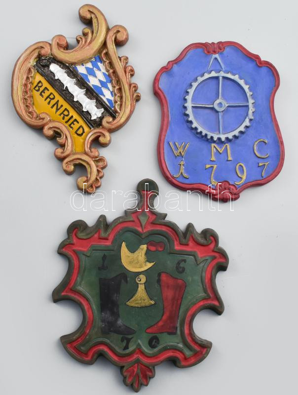 Leírás: 3 darab címer másolat: 2 db kerámia múzeumi másolat és 1 db gipsz. Kopással, m: 18-23 cm