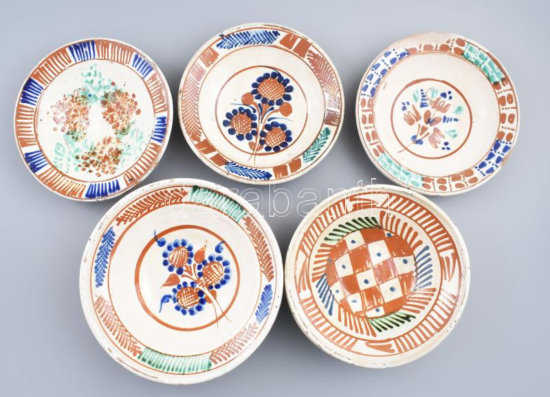 Leírás: 5 darab tál. Mezőség, 20. sz. eleje, sérülésekkel, d: 21-25 cm