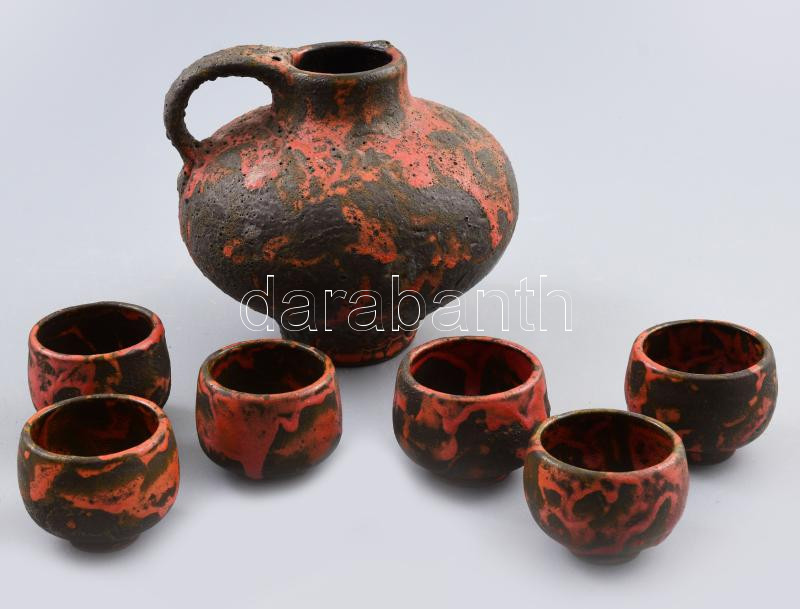 Leírás: cca 1950/60 Iparművész italos szett, jelzés nélkül, kis kopással, m: 12 cm, poharak m: 4,5 cm