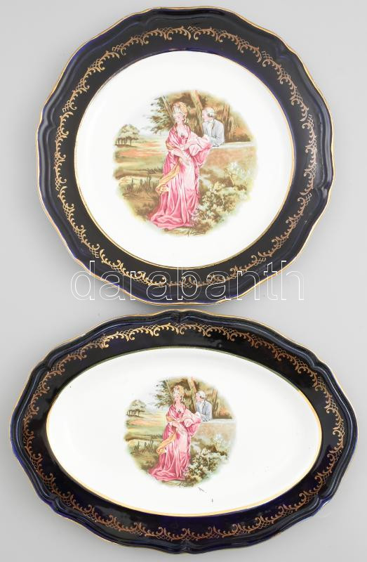 Leírás: 2 db francia klasszicizáló tál. Matricás, jelzett, kopásokkal d: 28 cm, 34x22 cm