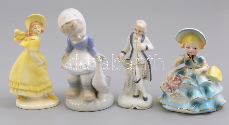Leírás: 4 db porcelán figura, kézzel festett, jelzetlen, egy lepattanással, egyik sérült, m: 11-13,5 cm