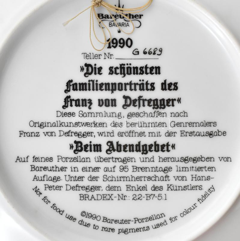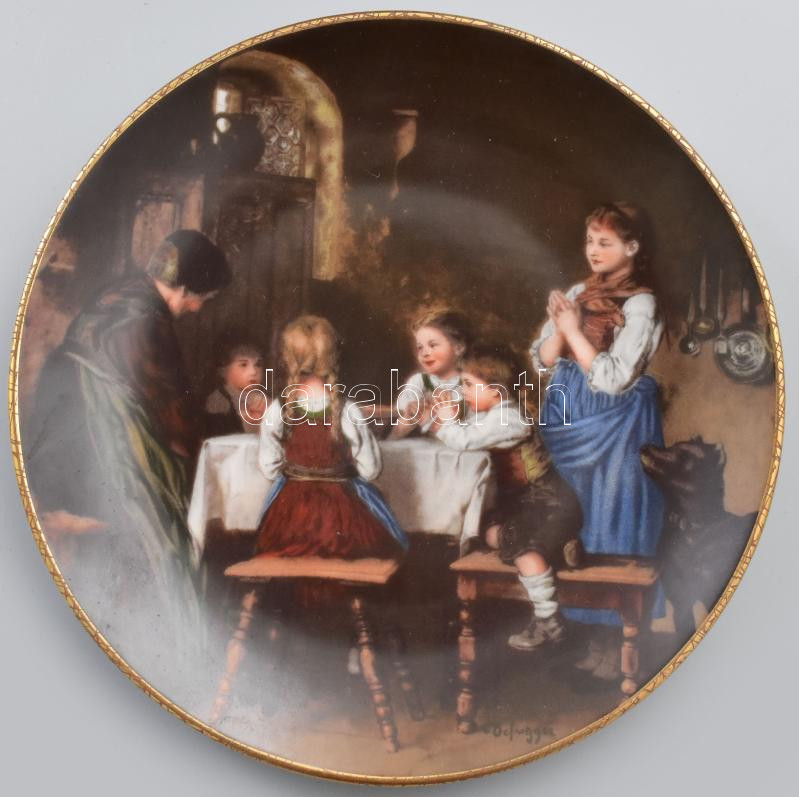 Leírás: Bareuther Bavaria porcelán fali dísztányér, Franz von Defregger sorozat, "Beim Abendgebet". Matricás, jelzett, számozott, hibátlan, d: 20 cm