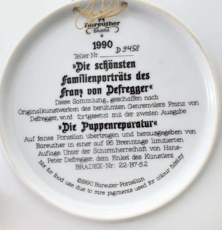 Leírás: Bareuther Bavaria porcelán fali dísztányér, Franz von Defregger sorozat, "Die Puppenreparatur". Matricás, jelzett, számozott, hibátlan, d: 20 cm