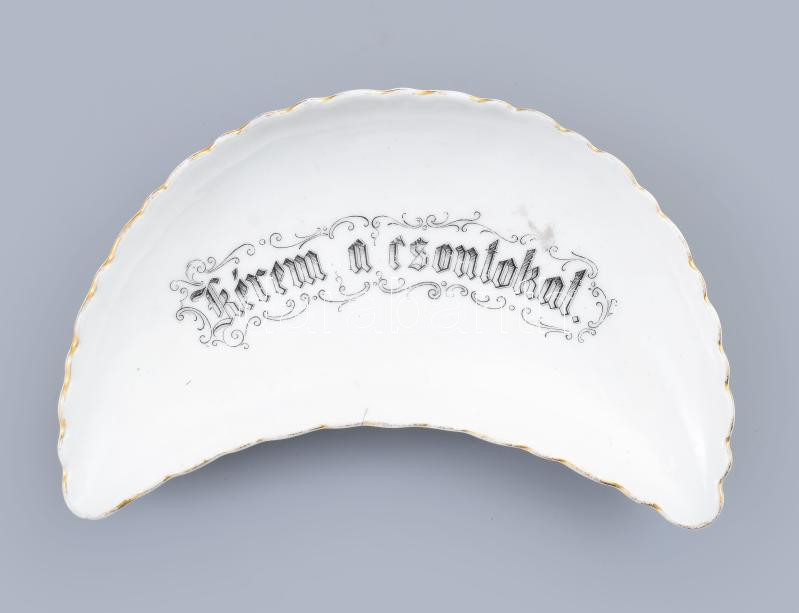 Leírás: Csontos tányér Kérem a csontokat felirattal. Jelzés nélkül, kopásokkal, kis tűzhibával, 17x11 cm