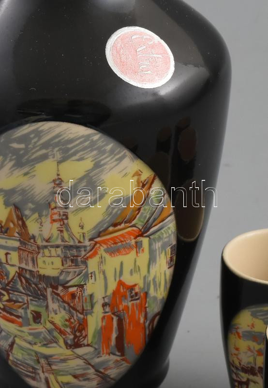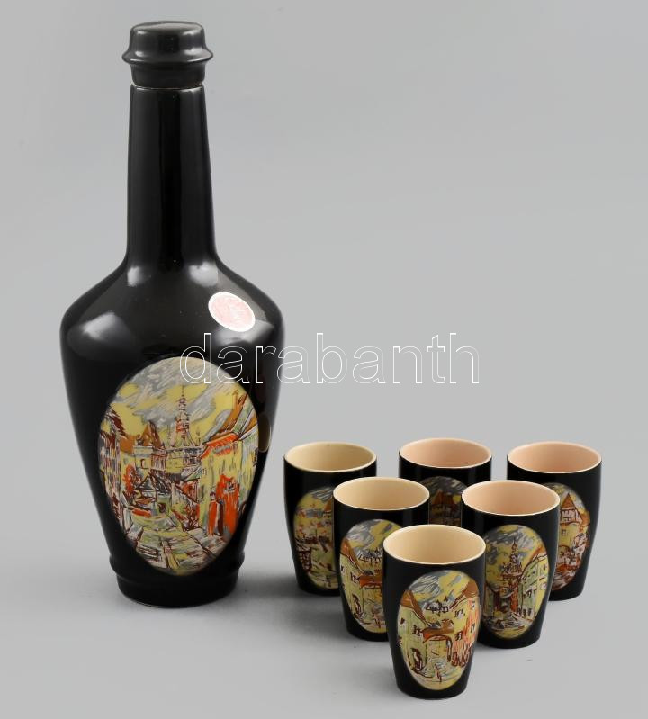 Leírás: Extra jelzésű pálinkás készlet, Kézzel festett, jelzett, hibátlan. hat személyes, városképeket ábrázoló poharak és üveg. 26 cm