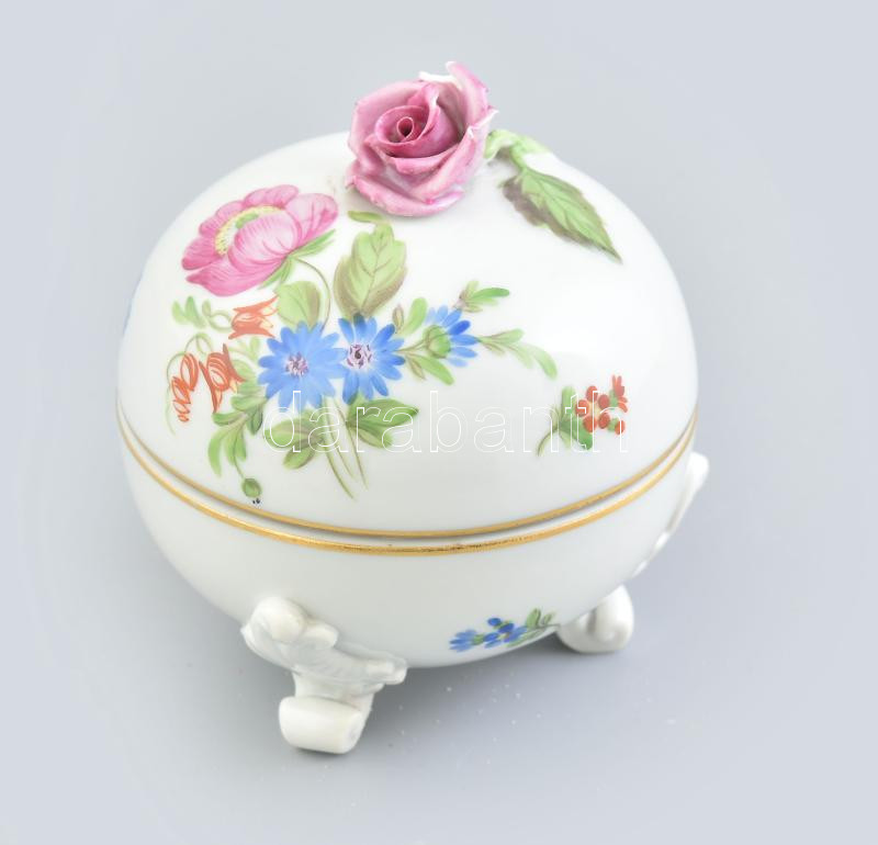 Leírás: Herendi porcelán rózsás bonbonniere. Kézzel festett, jelzett, sérüléssel d: 8 cm