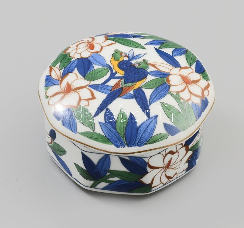 Leírás: Kézzel festett papagájos porcelán dobozka. Jelzés nélkül, hibátlan 10 cm
