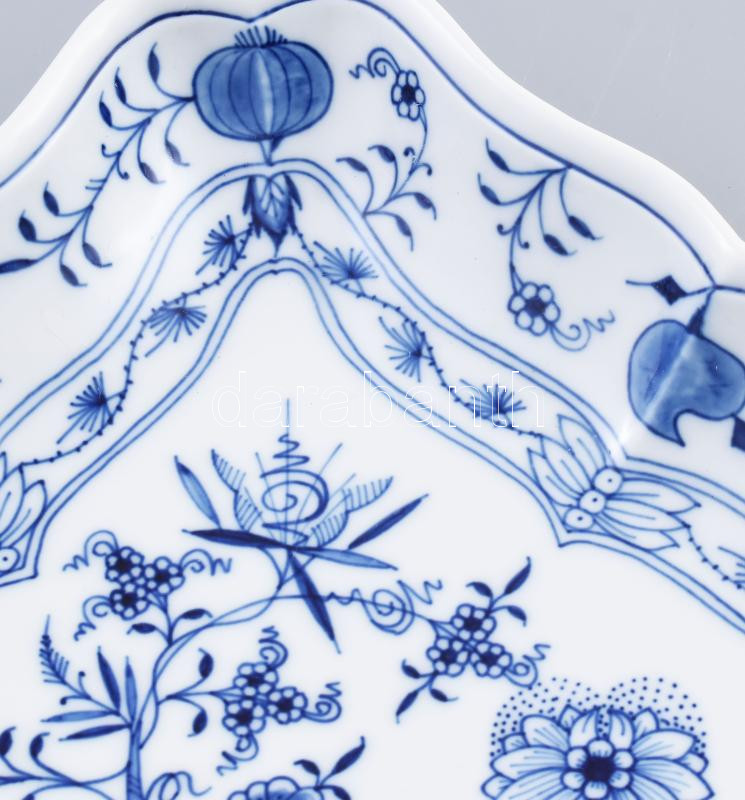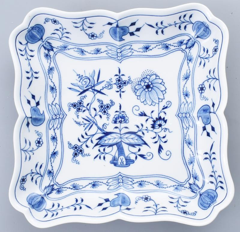Leírás: Meissen főzelékes tál, porcelán, mázalatti kobaltkék hagymavirág mintával, jelzett: kardos Royal Meissen, három csiszolt vonallal, hibátlan, 24,5x24,5 cm
