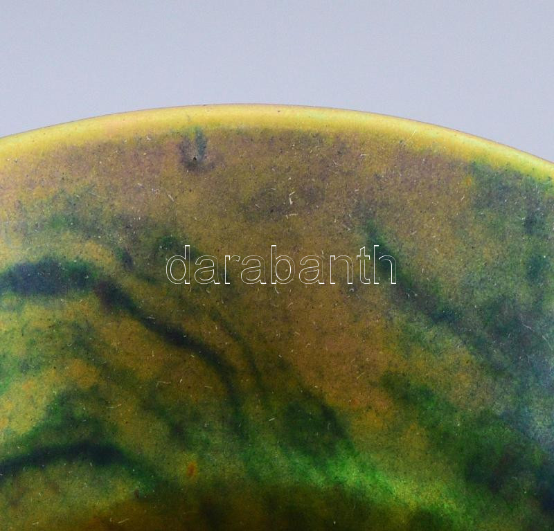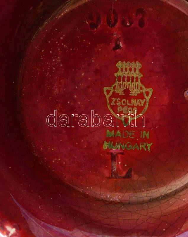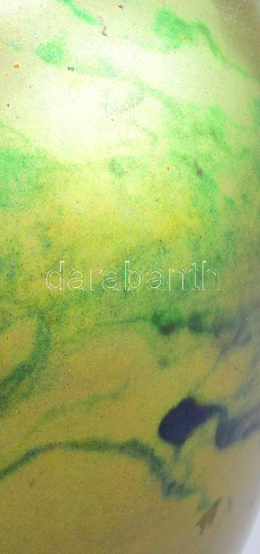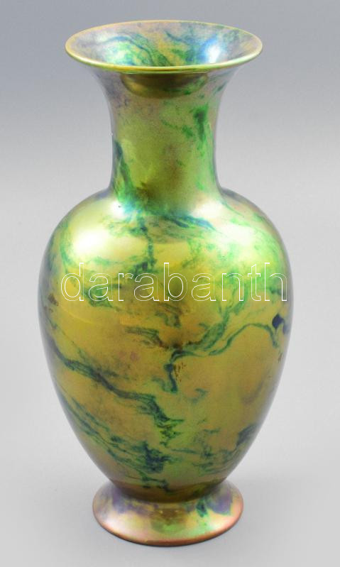Leírás: Zsolnay márványozott eozin váza. Márványozott eozin mázakkal festett korongozott porcelánfajansz, cca 1920-1930, alján vörös mázon eozin pajzspecsétes jelzéssel. Minimális mázkopással, m: 26 cm