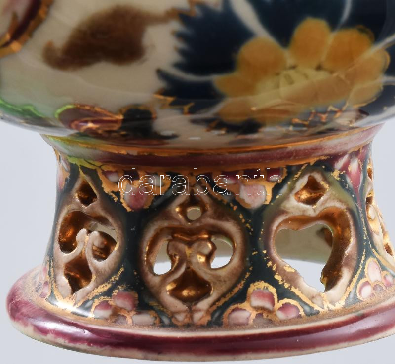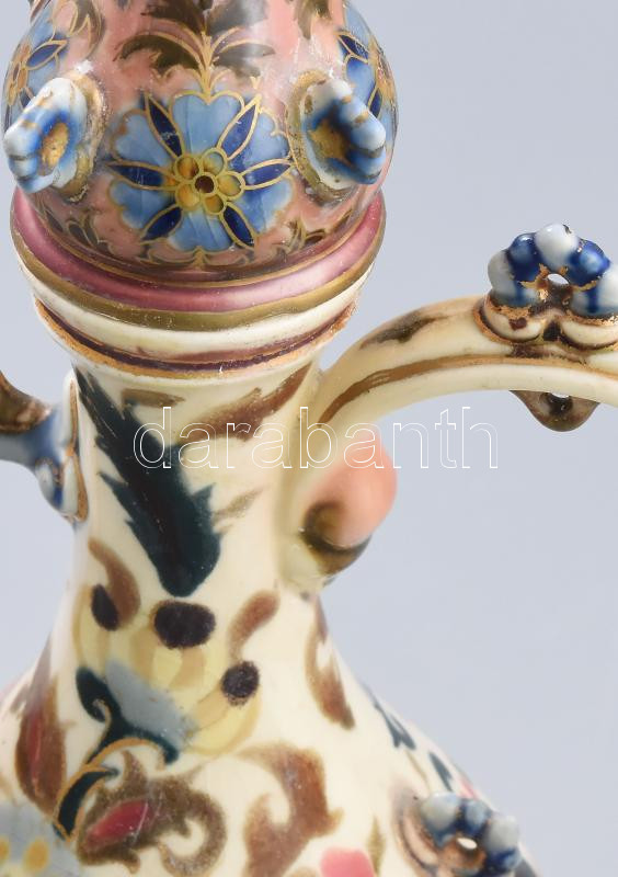 Leírás: Zsolnay perzsa mintás kiöntő. Benyomott Zsolnay Pécs jelzéssel, 1288-as formaszám. Kézzel festett, jelzett porcelánfajansz, sérülésekkel, 26,5 cm