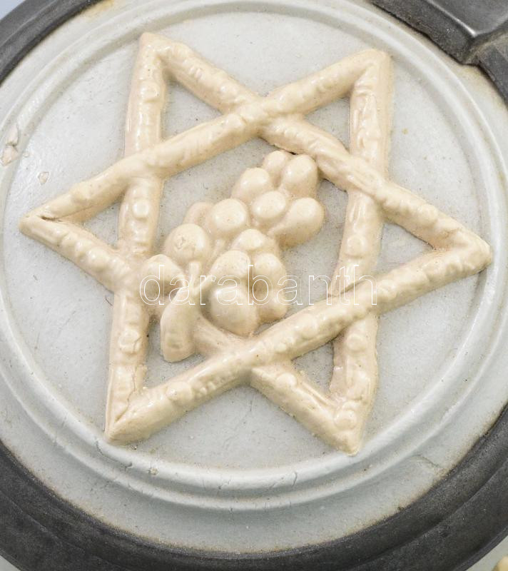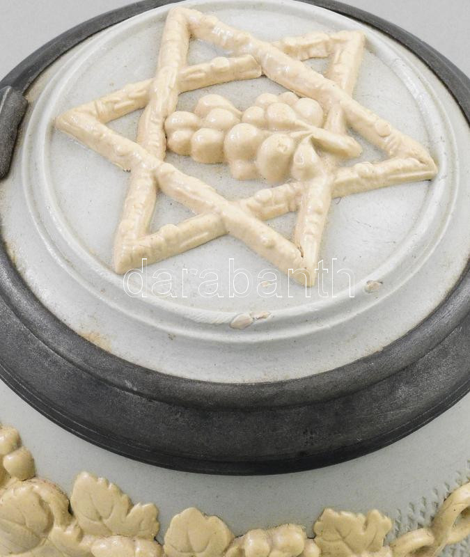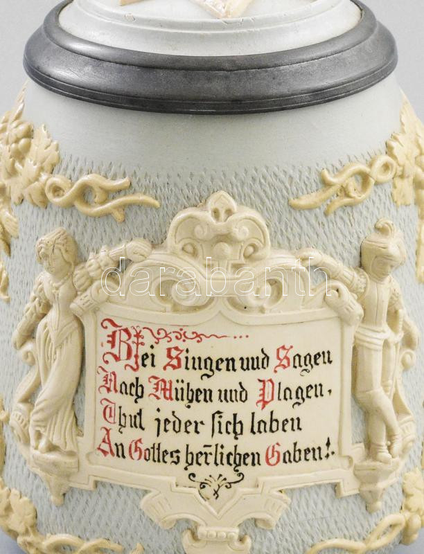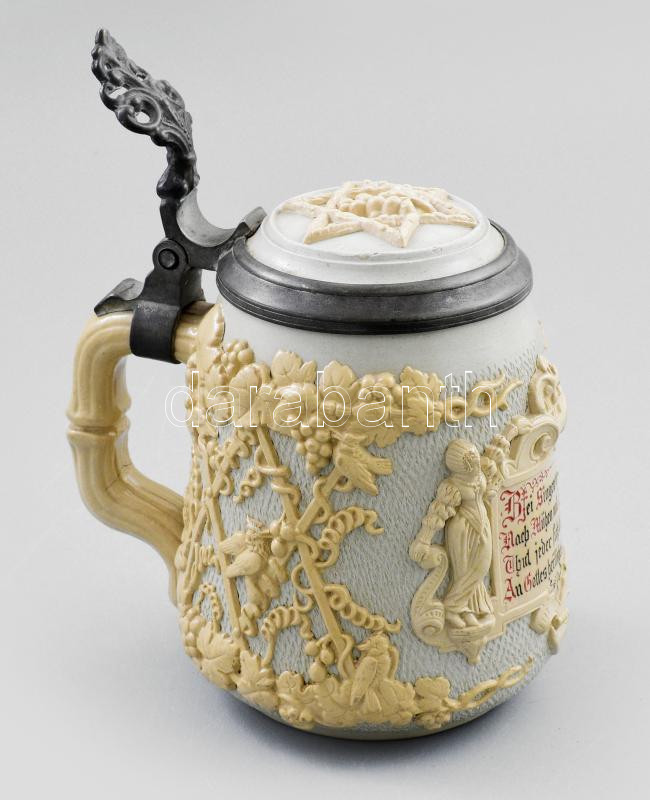 Leírás: cca 1900, Villeroy & Boch Mettlach Stein porcelán judaika boroskorsó. Opalinüveget utánzó krémporcelán alapon reliefszerű szőlő- és seregélyminták, elöl alakokkal közrefogott kartusban német szöveg. Billenthető ón fedélben belefoglalt porcelánon Dávid-csillag, benne szőlőfürt. Fogóján tűzhibával, apró kopottsággal, jelzett, m: 17 cm