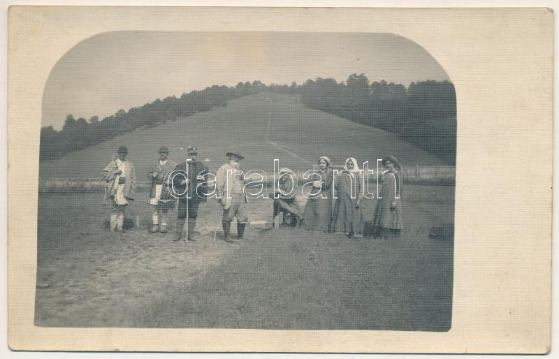 Leírás: 1913 Priszlop-hegység, Prislop (Máramaros, Maramures) (?); vadászok, erdélyi folklór / hunters, Transylvanian folklore. photo (ragasztónyom / glue marks)