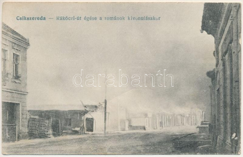 Csíkszereda, Mercurea Ciuc; Rákóczi út égése a románok kivonulásakor. A betörés után a román katonák felgyújtották a várost, égő utcakép, tűzvész. Rancz Gábor kiadása / WWI smoke and burned streets after the Romanian soldiers set fire to the city (fa)