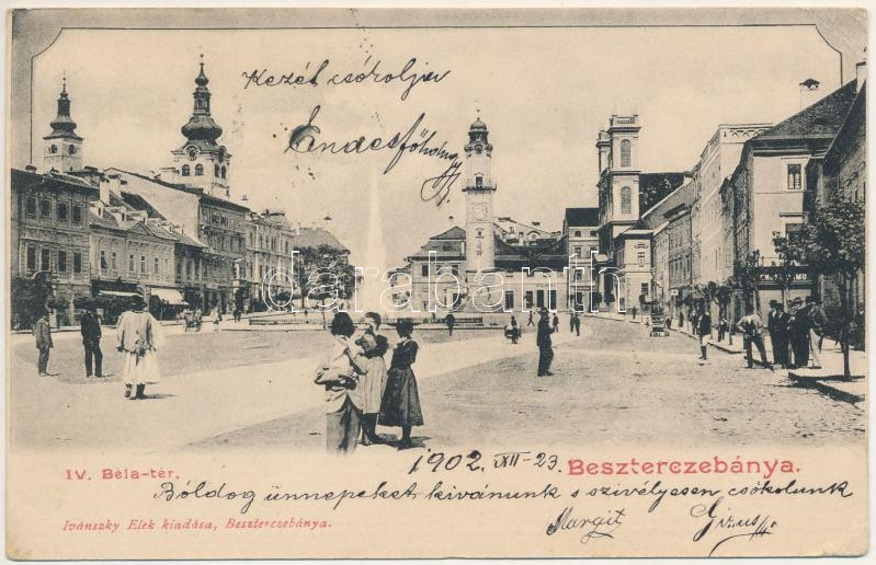 Leírás: 1902 Besztercebánya, Banská Bystrica; IV. Béla tér, városháza, üzletek, szökőkút. Ivánszky Elek kiadása / square, town hall, shops, fountain (EK)