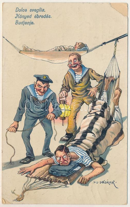 Leírás: 1915 Könnyed ébredés / Dolce sveglia / Budjenje / K.u.K. Kriegsmarine Matrosenhumor / WWI Austro-Hungarian Navy mariner humor. C. Fano Pola 14. 1914/15. s: Ed. Dworak (ázott / wet damage)