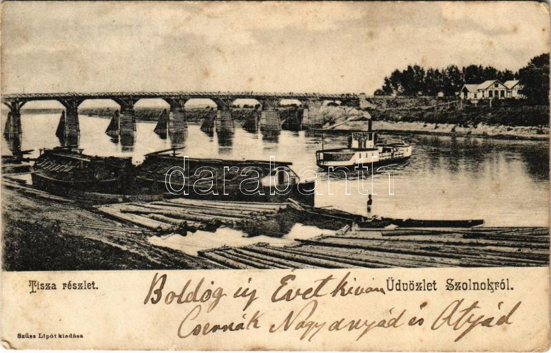 Leírás: 1901 Szolnok, Tisza részlet, híd, faúsztatás. Szüsz Lipót kiadása (Rb)