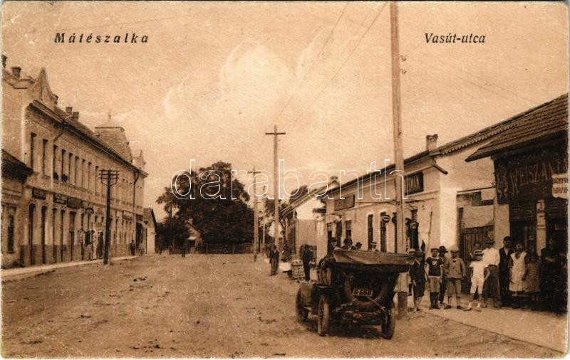 Leírás: Mátészalka, Vasút utca, autó, Weisz Antal könyvnyomdája, üzlete és saját kiadása (fa)