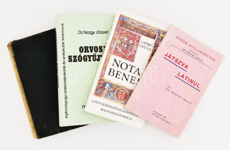 4 db latin témájú könyv: Magyar-Latin szótár; Játszva latinul; Nota Bene. Latin kifejezések, elnevezések magyarázatokkal; Orvosi latin szógyűjtemény. Változó állípotban.