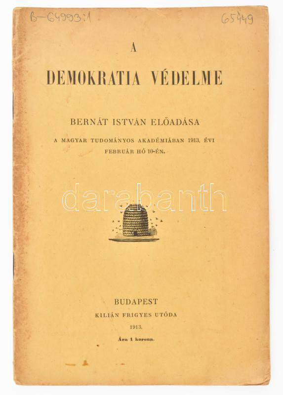 A demokratia védelme. Bernát István előadása A Magyar Tudományos Akadémiában 1913. évi február hó 10-én. Bp., 1913, Kilián Frigyes utóda, foltos, kissé szakadt kiadói papírkötés.