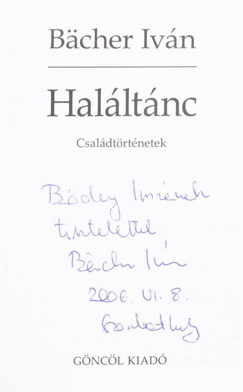 Bächer Iván: Haláltánc. Családtörténetek. A szerző, Bächer Iván (1957-... https://www.darabanth.com/hu/458-Gyorsarveres/458.0/Konyvek/Konyvek-Egyeb-ritkasagok~1500034/Bacher-Ivan-Halaltanc-Csaladtortenetek-A-szerzo-Bacher-Ivan-1957-2013-altal-DEDIKALT-Bp-~II3068884