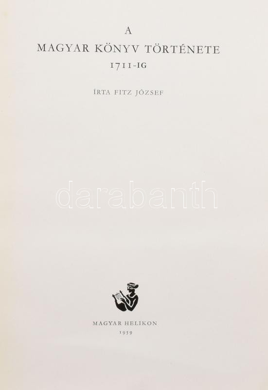 Fitz József: A magyar könyv története 1711-ig. (Fitz-Kéki: A magyar könyv története I. rész). Bp., 1959, Magyar Helikon. Fekete-fehér és színes képekkel illusztrált. Kiadói egészvászon-kötés, minimálisan sérült, fakó gerinccel, a borítón némi kopással. Megjelent 5200 példányban.