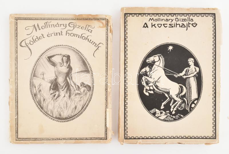Mollináry Gizella 2 műve: Földet érint homlokunk! A szerző, Mollináry Gizella (1896-1978) írónő által ALÁÍRT példány! Bp., 1929, Szerző,("Otthon"-ny.), 78 p. A borító Gebauer Ernő (1882-1962) festőművész munkája. Kiadói papírkötés, szakadozott, kissé foltos borítóval, sérült kötéssel.; A kocsihajtó. Bp., 1934, Szerzői kiadás,("Otthon"-ny.), 161+1 p. A borító Gebauer Ernő (1882-1962) festőművész munkája. Kiadói papírkötés, szakadozott borítóval, javított gerinccel.;