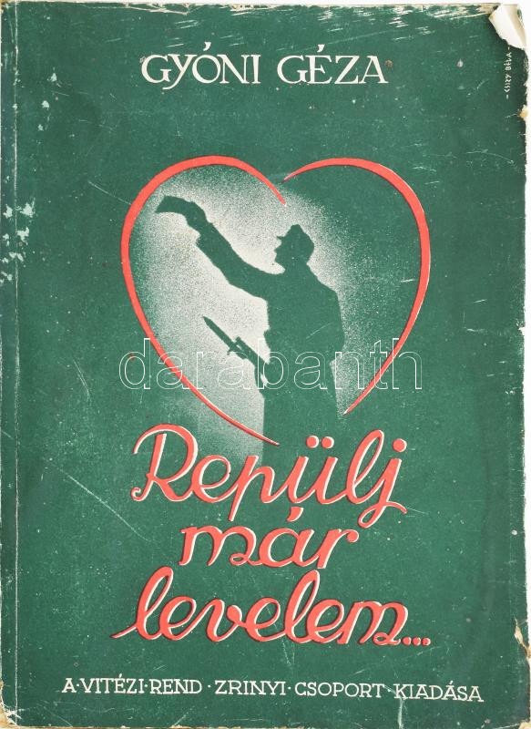 Gyóni Géza: ,,Repülj már levelem..." (A katonaköltő ,,őrangyal-"ához írt szerelmes levelei). Sajtó alá rendezte: Gyóni Ferenc. Bp., 1942, Vitézi Rend Zrínyi Csoportja. A borító Csizy Béla munkája. Kiadói papírkötés, viseltes, sérült, foltos borítóval, helyenként kissé foltos lapokkal, a képtáblák egy része és a térkép hiányzik.