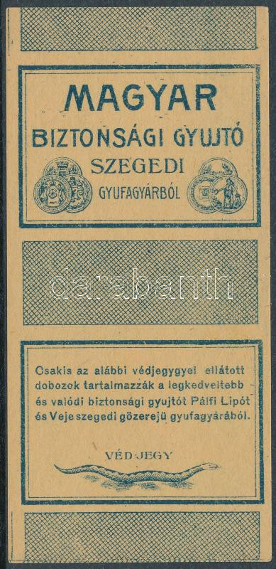 Leírás: Pálfi Lipót és Veje szegedi gyufacímke 1895-1909, a Szegedi Gyufagyár 1895-1909 között működött Pálfi Lipót és Veje gőzüzemű gyufagyár néven