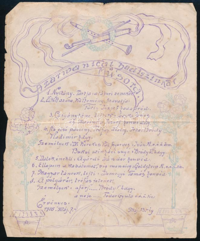1916 A zarwanicai hadiszínkör műsora. A zarwanicában (Zarvanytsya / Zarwanycia, Ukrajna), állomásozó magyar katonák hadiszínkörének 1916. május 7. és 13. között érvényes, stencilezéssel sokszorosított műsora, a jobb alsó sarokban a rajzoló olvashatatlan szignójával. Hajtott, kis lapszéli sérülésekkel, foltokkal, 21x17 cm. Ritka!