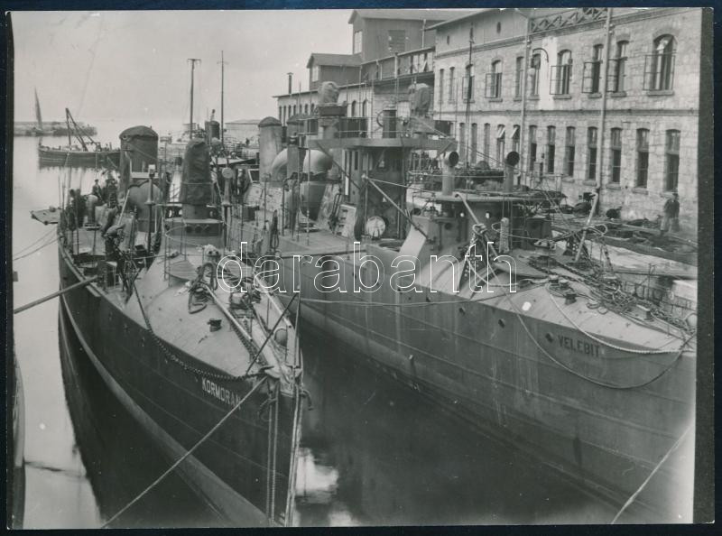 Az S.M.S. Kormoran és az S.M.S. Velebit osztrák-magyar hadihajók a Ganz Danubius fiumei kikötőjében az 1909-es elkészültük után. Régi fotó modern nagyítása 18x13 cm / Large modern reproduction from an original negative showing S.M.S. Velebit and the torpedo boat S.M.S. Kormoran tied to the dock in the Danubius outfitting basin in 1909. Clear, sharp photograph showing S.M.S. Velebit in great detail shortly before she was commissioned on December 31, 1909. S.M.S. Kormoran went into service three months later.