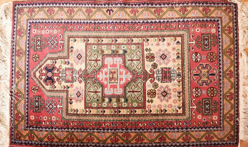 Leírás: Keleti kézi készítésű szőnyeg, kis rojthiánnyal, de összességében jó állapotban, cca 155x90 cm