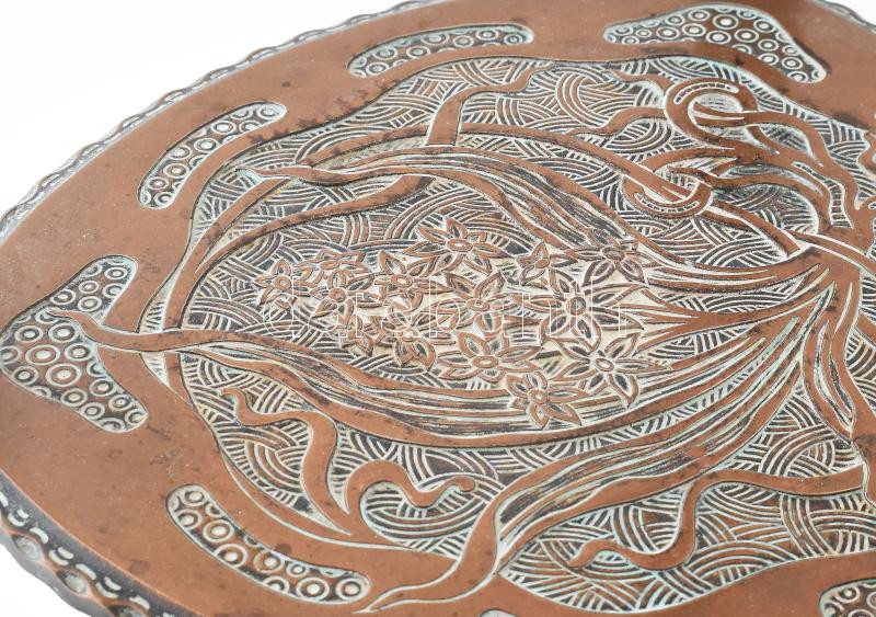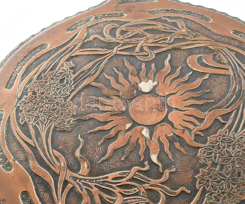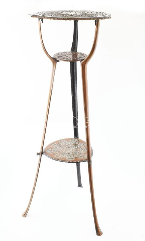 Nagy méretű bronzírozott öntöttvas asztal virágállvány. szecessziós nap mintával.. Patinázott, gyártói jellel jelzett, magyar gyártmány 109 cm d: 40 cm