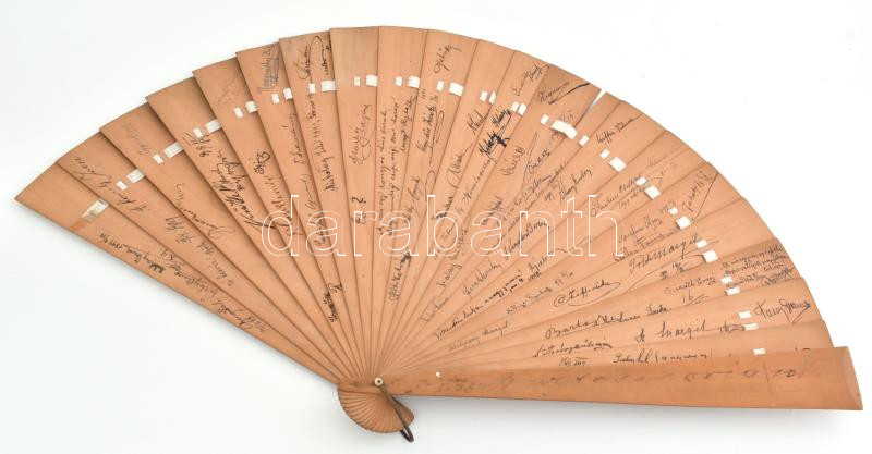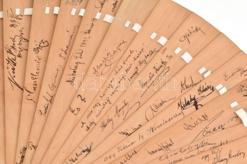 cca 1900 Nagy méretű fa legyező, minden lapján lányok emlékírásaival, ... https://www.darabanth.com/hu/458-Gyorsarveres/458.0/Mutargy-papirregiseg-egyeb/Mutargyak-antikvitas~1000009/cca-1900-Nagy-meretu-fa-legyezo-minden-lapjan-lanyok-emlekirasaival-alairasok-nehol-rovid~II3042327