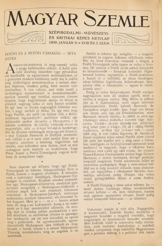 1906 A Magyar Szemle Szépirodalmi-Művészeti és Kritikai Képes Hetilap egybekötött XVIII. évf. 2-39. számai, 1906. január 11.-1906. szeptember 27. Sérült, enyhén szétvált félvászon-kötésben. Hiányos.