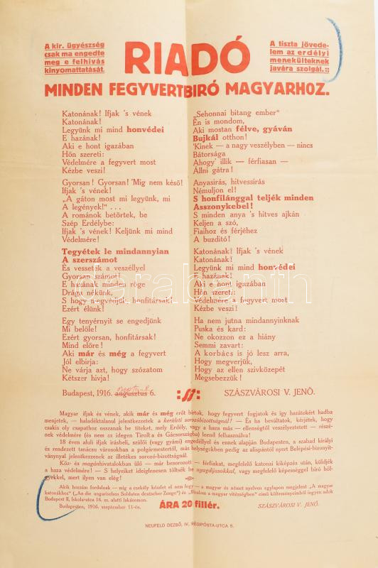 1916 Bp., "Riadó minden fegyvert bíró magyarhoz" - hadba vonulásra biz... https://www.darabanth.com/hu/458-Gyorsarveres/458.0/Mutargy-papirregiseg-egyeb/Nyomtatvanyok~1500039/1916-Bp-Riado-minden-fegyvert-biro-magyarhoz-hadba-vonulasra-biztato-plakat-hajtott-~II3066401