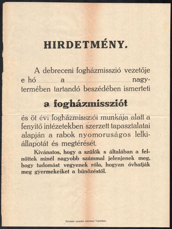 Leírás: cca 1900 Tahitótfalu a debreceni fogházmisszió tapasztalatairól szóló, bűnmegelőző előadás hirdetménye 23x31 cm