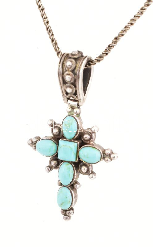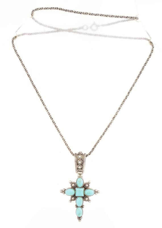 Leírás: Ezüst(Ag) kövekkel díszített kereszt medál láncon, jelzett, h: 44 cm, 4,5×2,5 cm, bruttó: 14 g