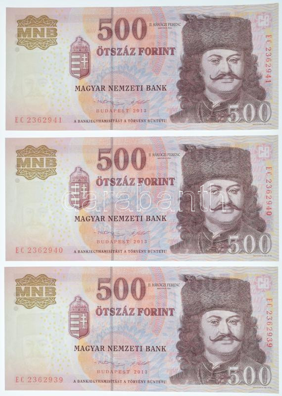 2013. 500Ft (3x) sorszámkövetők "EC 2362939 - EC 2362941" T:UNC https://www.darabanth.com/hu/458-Gyorsarveres/458.0/Numizmatika/Magyar-bankjegyek~500007/2013-500Ft-3x-sorszamkovetok-EC-2362939-EC-2362941-T-UNC~II3064672