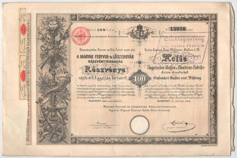 Budapest 1888. "A Magyar Fegyver- és Lőszergyár Részvénytársaság" részvénye 100Ft-ról szárazpecséttel, bélyegzésekkel, szelvényekkel T:F kis beszakadások