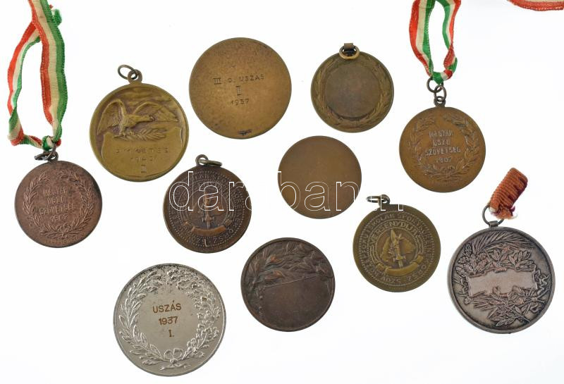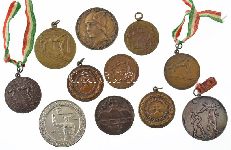 Leírás: 11db-os, nagyrészt úszó díjérem tétel, közte 1936. "Magyar Általános Hitelbank Tisztviselőinek Sportegylete 1912" bronz díjérem, hátoldalán "Uszás III. 1936" gravírozással (30mm) T:XF