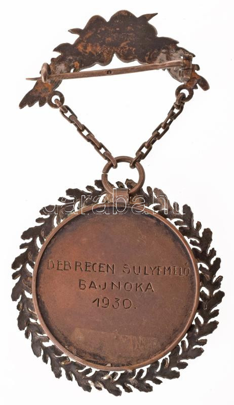 Leírás: 1930. "Debrecen Súlyemelés Bajnoka 1930" láncos, Debrecen címerét ábrázoló láncos jelvény, "SGA" gyártói jelzéssel (44mm) T:XF