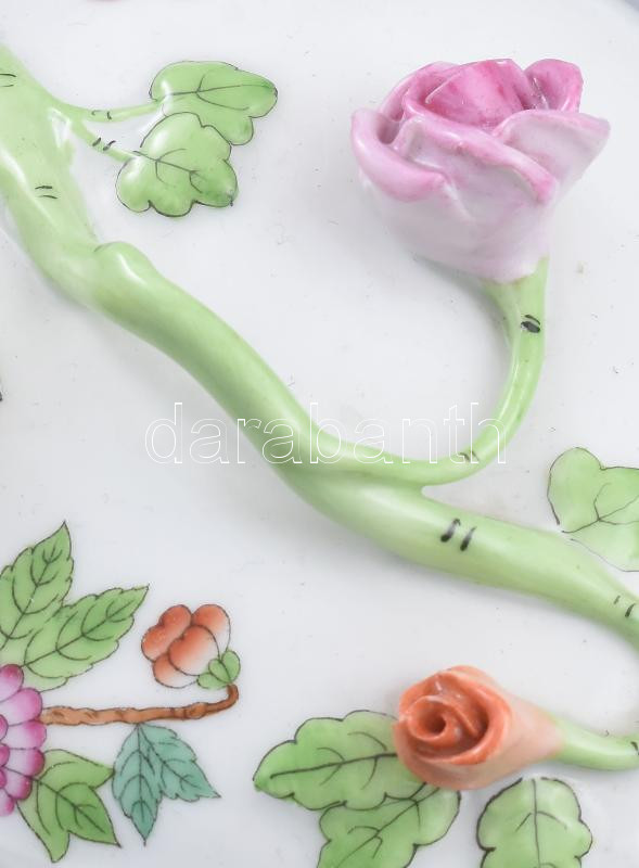 Leírás: Herendi Viktória mintás szív alakú bonbonier, futórózsa fogóval. Jelzett, kézzel festett, háncsnyomott peremrésszel díszített, hibátlan, 13x12x11 cm