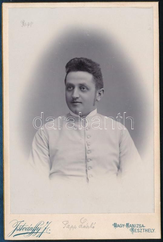 Leírás: cca 1910 Nagykanizsa, Istvánffy fényképész műtermében készült, keményhátú vintage fotó, felirata szerint Papp Lászlót ábrázolja, 16,1x10,7 cm