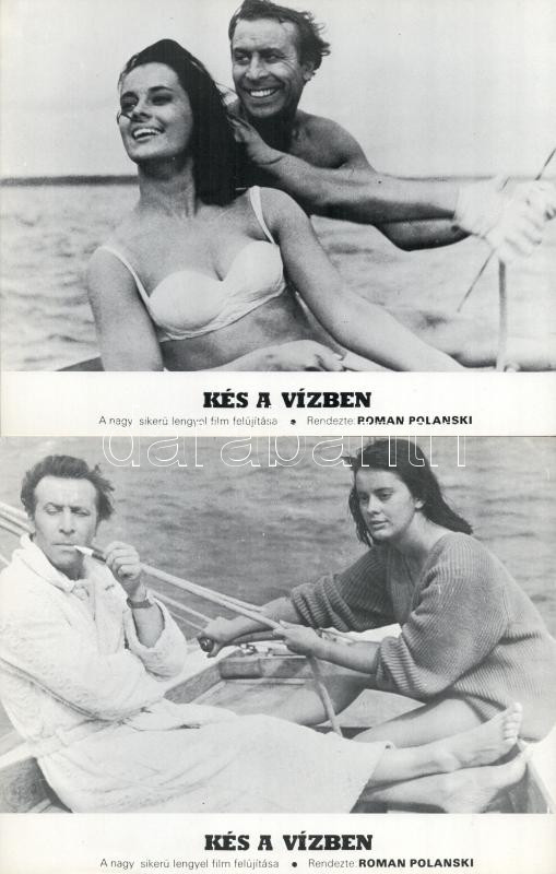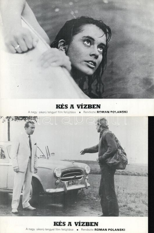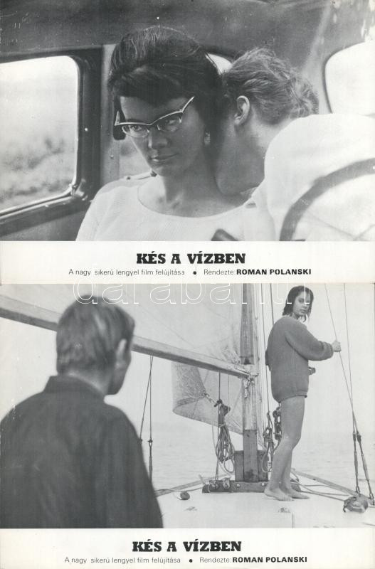 cca 1962 ,,Kés a vízben" című lengyel film jelenetei és szereplői, 6 db produkciós filmfotó (vitrinfotó, lobbyfotó) nyomdatechnikával sokszorosítva kartonpapírra, egyoldalas nyomással, a használatból eredő (esetleges) kisebb hibákkal, 18x24 cm