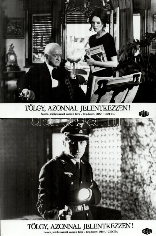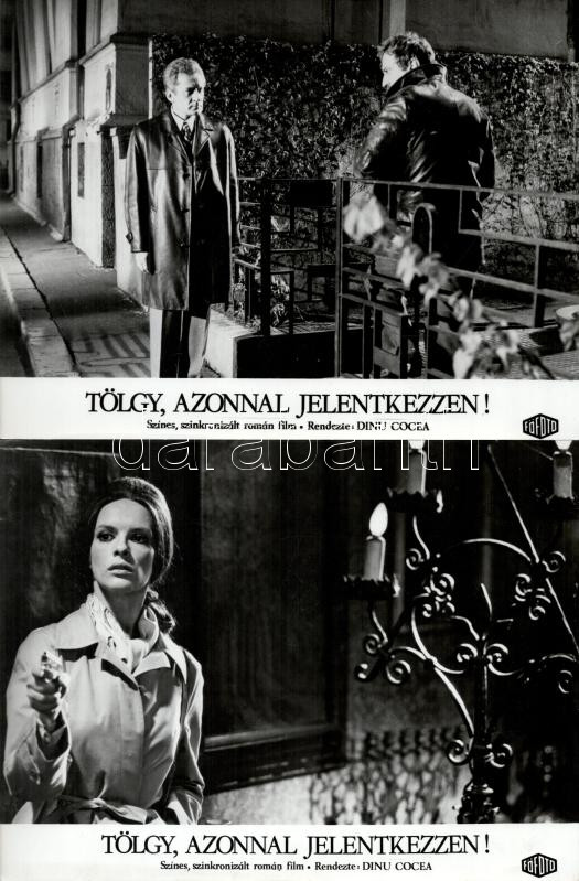 cca 1973 ,,Tölgy, azonnal jelentkezzen!" című román film jelenetei és szereplői, 17 db vintage produkciós filmfotó (vitrinfotó, lobbyfotó) ezüst zselatinos fotópapíron, a használatból eredő (esetleges) kisebb hibákkal, 18x24 cm