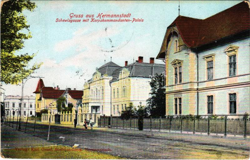 Leírás: 1908 Nagyszeben, Hermannstadt, Sibiu; Schewisgasse mit Korpskommandanten-Palais / Schewis utca, Hadtestparancsnokság palotája. Karl Graef kiadása / street view, K.u.K. military headquarters (EK)